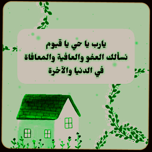 Arabic prayer for forgiveness and well-being, with a green house illustration. Features Mona and other names.