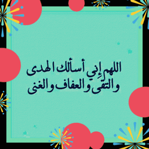 A vibrant animated prayer card with an Arabic supplication for guidance, piety, chastity, and richness, surrounded by festive elements.