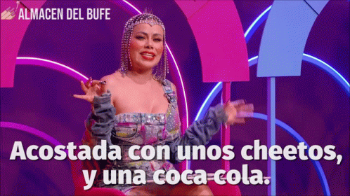 Yari Mejia relaxing with Cheetos and Coca-Cola, wearing a sparkling denim outfit on 'Almacen Del Bufe'.