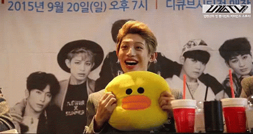 Kim Jinwook of Up10tion, holding a yellow duck plushie, smiling excitedly in front of a group photo.