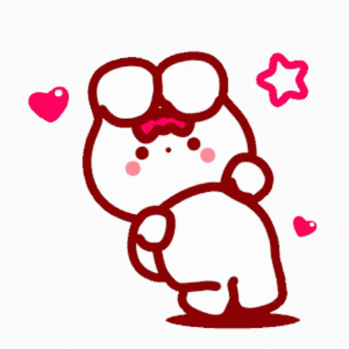 A cute cartoon bunny with a bow on its head happily dancing with hearts around it.