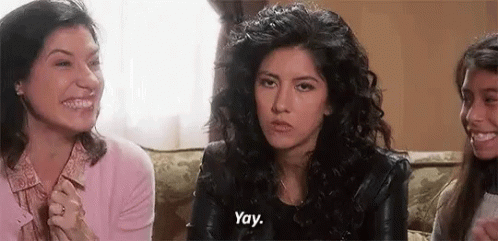 Rosa Diaz delivers a perfectly sarcastic 'Yay' while sitting with friends, showcasing her signature deadpan humor.