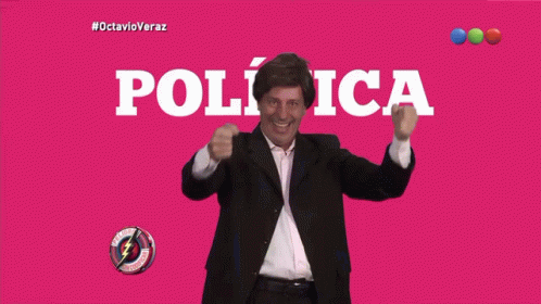 Yayo as Octavio Veraz in a suit, standing in front of a sign that says 'POLÍTICA'.