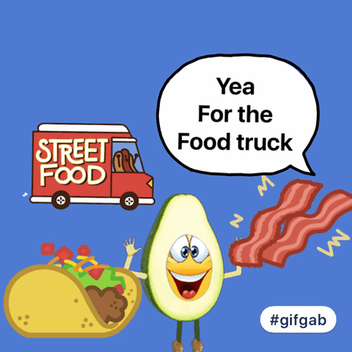 A happy avocado celebrates a street food truck, surrounded by a taco and bacon. Yea for the food truck!