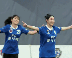 Female soccer player in a blue FC jersey celebrates a victory with arms outstretched and a big smile.