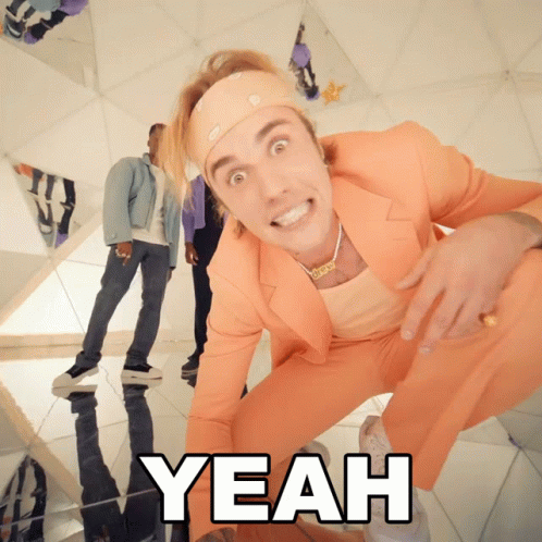 Justin Bieber in an orange suit and bandana, kneeling with an excited expression, with 'YEAH' text.