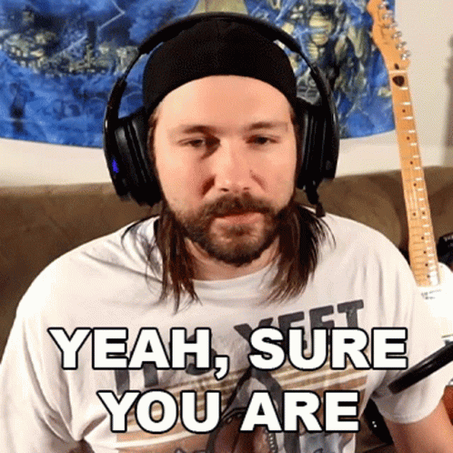 Michael Kupris, wearing headphones, delivers the sarcastic line 'Yeah, Sure You Are' with a knowing look.