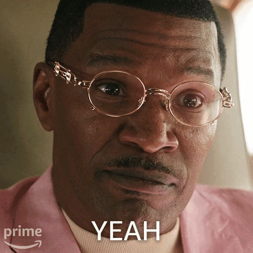 Jamie Foxx, portraying Willie Gary, wears glasses and a pink suit, saying 'Yeah'.