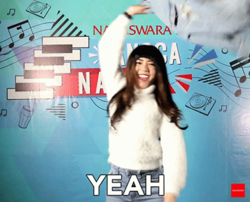 Woman in white sweater enthusiastically shouts 'Yeah' with a denim jacket in hand, celebrating joyfully.