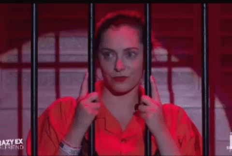 Rebecca Bunch, from Crazy Ex-Girlfriend, enthusiastically shouts 'Yeah!' from a jail cell.