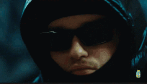 Yeat wearing sunglasses and a hooded jacket, adjusting his hood in a mysterious setting.