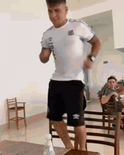 Yeferson Soteldo, a Santos FC player, energetically dances on a table and chairs, bringing joy to his teammates.