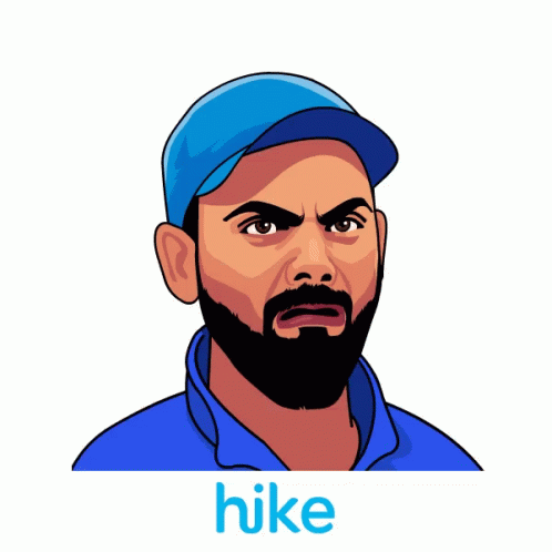 Cartoon sticker of Indian cricketer Virat Kohli with an angry, yelling expression, featuring the Hike logo.