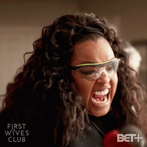 Hazel Rachelle (Jill Scott) from First Wives Club yells intensely, wearing safety glasses.
