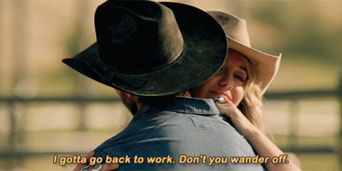 Abby (Lainey Wilson) from Yellowstone tells a man in a cowboy hat, 'I gotta go back to work. Don't you wander off.'