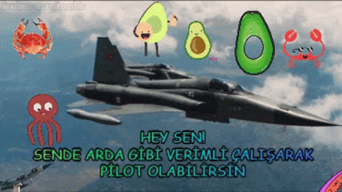 Fighter jet flying with animated crabs, avocados, and octopus, encouraging viewers to become a pilot like Arda Köse.