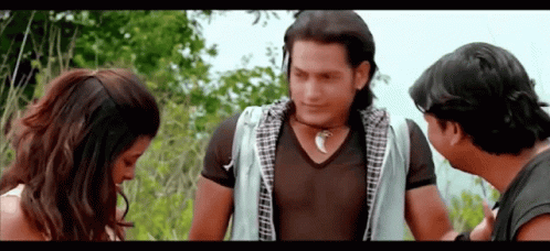Ace, a man wearing a shark tooth necklace, talks to two other people in a scene from a Nepali movie.