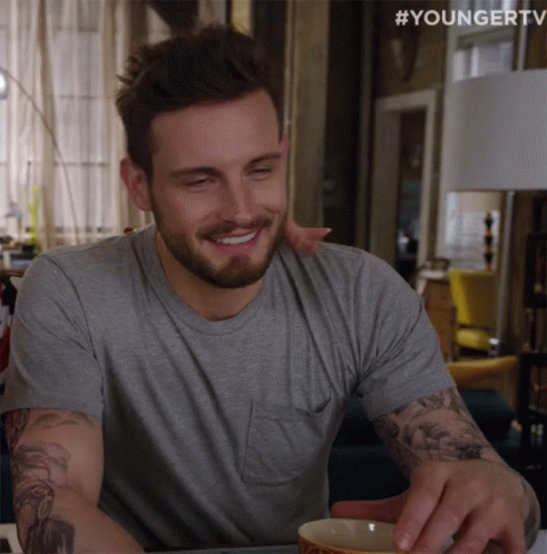 Nico Tortorella smiles and gestures, expressing agreement with 'Yes Alright' from #YOUNGERTV.