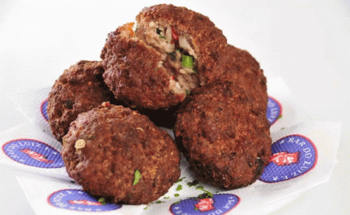A close-up of delicious, fried meatballs, one broken open to show a savory filling, served on a napkin.