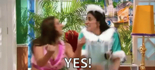Federica Peluche (Consuelo Duval) and Barbara Torres celebrate with an enthusiastic 'YES!' on a vibrant set.