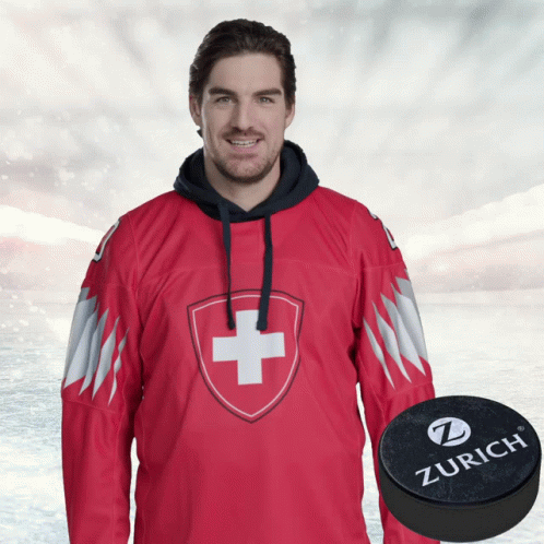 A Swiss hockey player in a red jersey celebrates a goal with a Zurich puck.