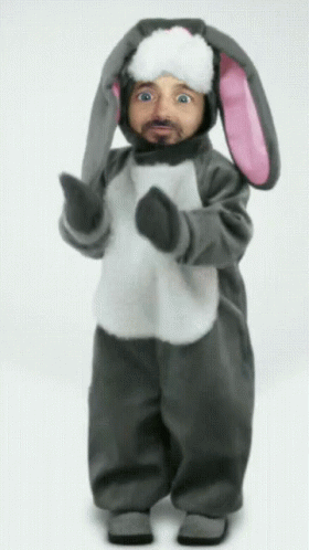 A man with a beard in a grey bunny costume dancing and looking surprised.