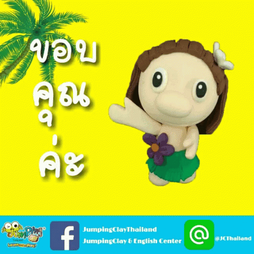 A cute Jumping Clay character, dressed in a hula skirt, waves and says 'Thank You' in Thai.
