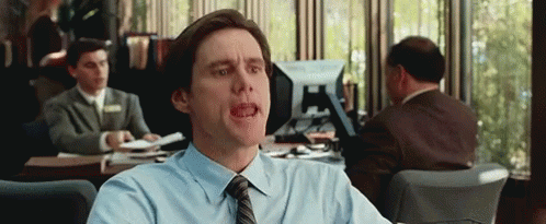 Jim Carrey as Carl Allen in Yes Man, enthusiastically saying "Yeah..." in an office setting.