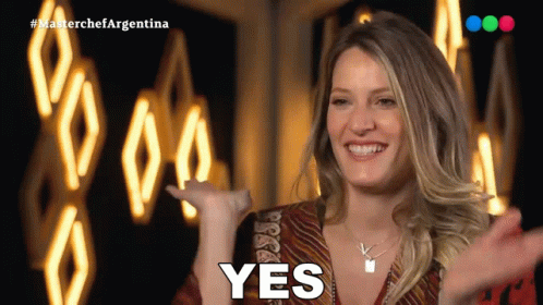 Mica Viciconte enthusiastically says 'YES' on Masterchef Argentina, smiling and pointing.