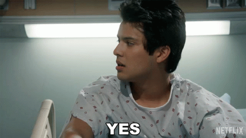 Miguel Diaz, played by Xolo Maridueña, in a hospital gown, says "YES".