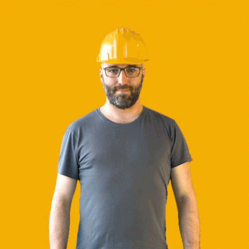 A man in a yellow hard hat and glasses nods his head, indicating agreement or approval.