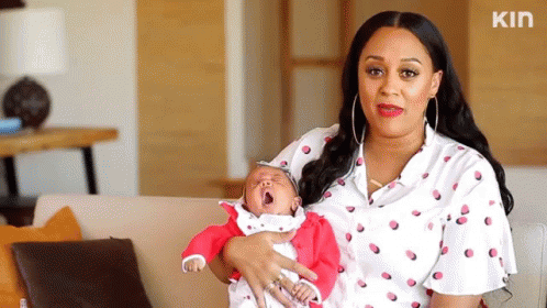 Tia Mowry holds a newborn baby who yawns, then cries with a "YEP!" speech bubble appearing on screen.