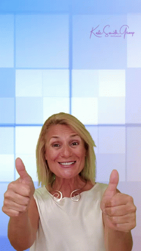 Kate Smith enthusiastically gives two thumbs up and claps, exclaiming 'Yessss!' against a blue background.