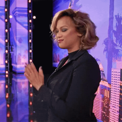 Tyra Banks on America's Got Talent, enthusiastically pumping her fist and smiling.