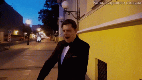 Yevgeny Ponasenkov, dressed in a tuxedo, walks and gestures animatedly on a street at night, possibly performing.