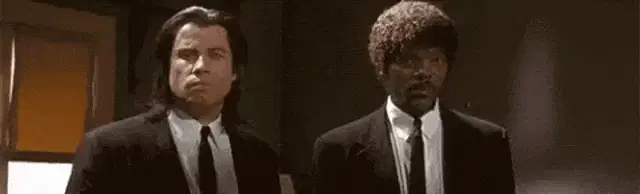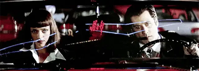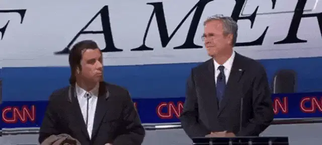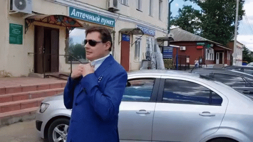 Yevgeny Ponasenkov channels Travolta, adjusting his tie and gesturing in front of a Russian pharmacy.
