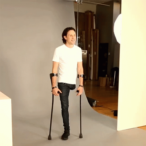 Josh Sundquist raises his arms in triumph, smiling brightly while standing with crutches in a studio.
