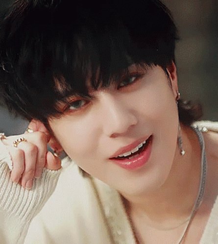GOT7's Yugyeom smiles brightly in a close-up shot, showcasing his charming features and stylish accessories.