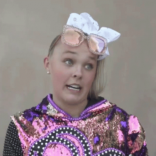 Jojo Siwa makes a funny, expressive face, wearing a sequined top, large bow, and sunglasses.