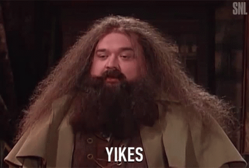 Hagrid from Saturday Night Live reacts with a wide-eyed, surprised 'Yikes' expression.