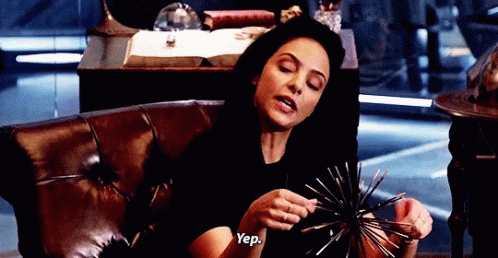 Zari Tomaz from Legends of Tomorrow on a couch, holding a spiky sculpture and saying "Yep, it sucks."
