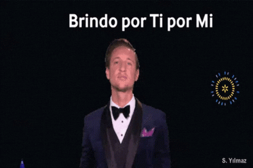 A man in a tuxedo raises a champagne glass in a festive toast, with the text "Brindo por Ti por Mi" displayed.