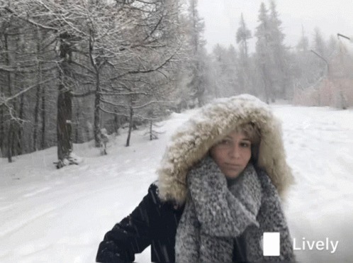 A woman in a fur-hooded jacket and scarf stands in a snowy forest, looking at the camera.