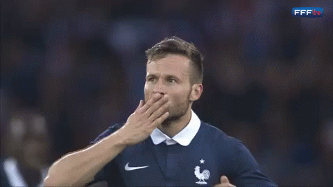 Yohan Cabaye, a French football player, blows a kiss to the crowd while wearing his national team jersey.