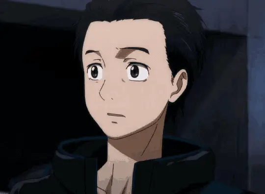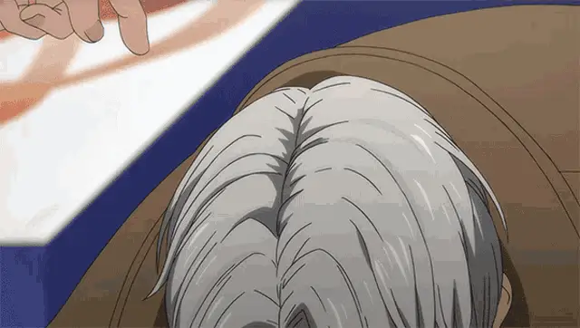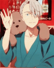 An anime man in a blue robe waves with his dog, a cute brown poodle-like teddy bear.
