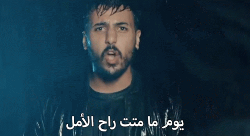 Wessam Qutb stands in the rain, with Arabic lyrics 'The day I died, hope was gone' displayed.