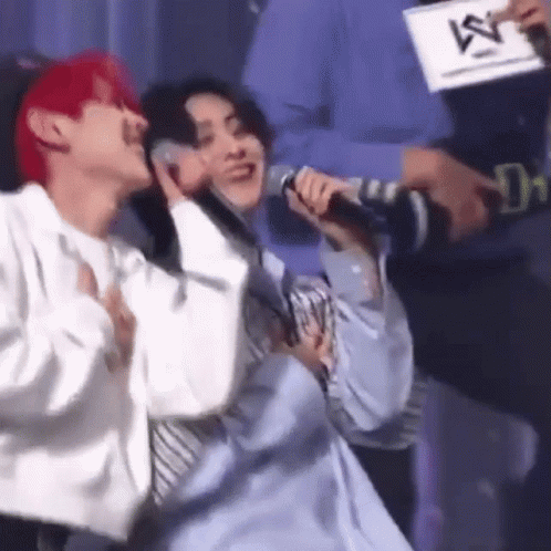 Yongha and Daehyeon of WEi share a hilarious moment on stage, with Daehyeon falling over in laughter.