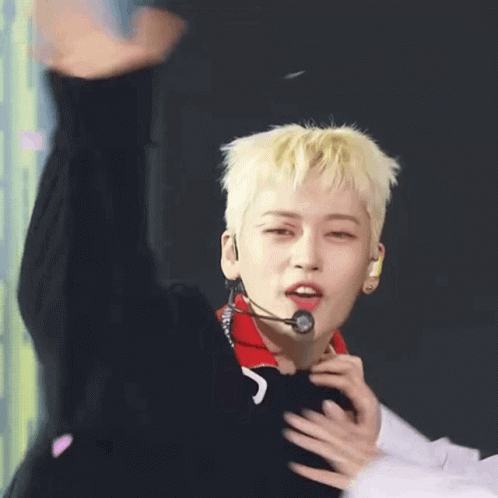 K-pop idols Yongha and Seokhwa share a playful moment on stage, smiling and interacting with each other.