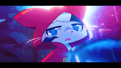 Yonkagor, a cat-like character, crying in the rain, reflecting the song 'Linger In The Rain'.