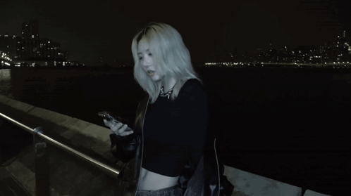 K-pop idol Yoohyeon or Dami from Dreamcatcher talking on her phone at night by the water.